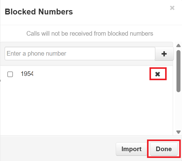 b. Click on the Blocked Numbers tab. In the pop-out window click the x and then Done.