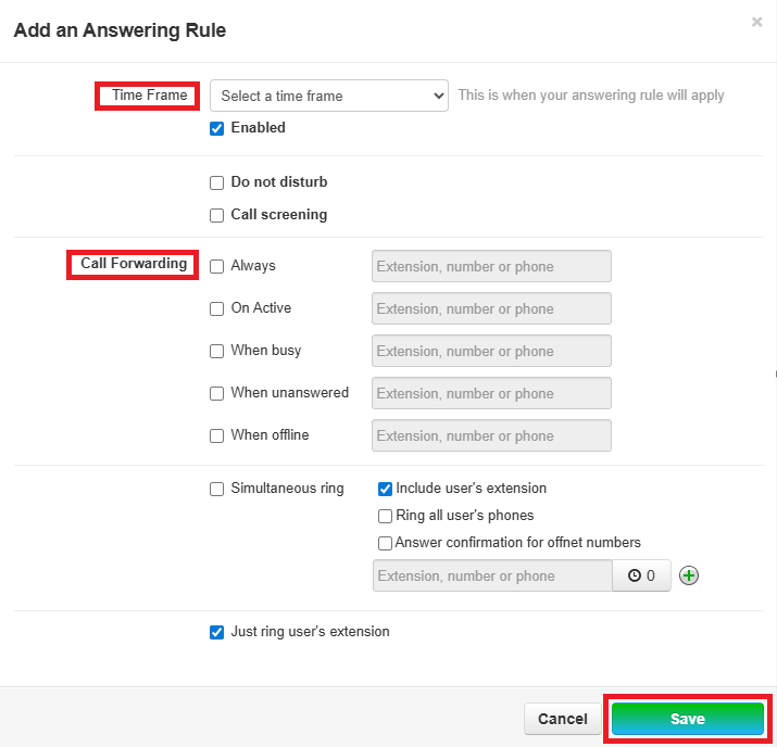 Time Frames affect setting up your Auto Attendants (see documentation) and User's Answering Rules (see documentation)