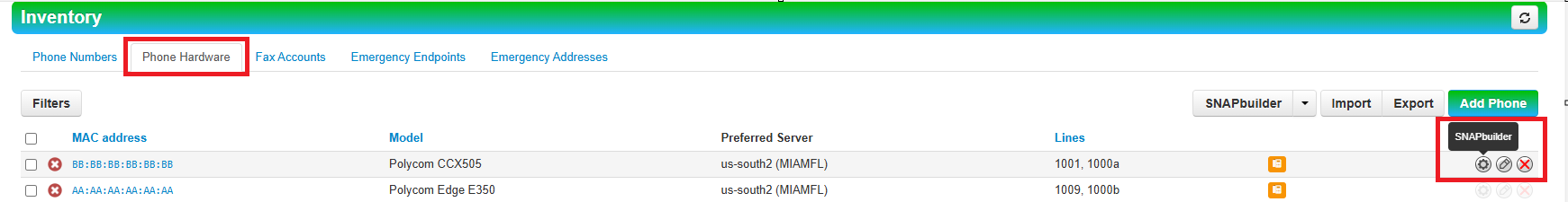 9. Click the Phone Hardware tab, locate Ext 1001 phone and click the gear to enter SNAPBuilder.image.png
