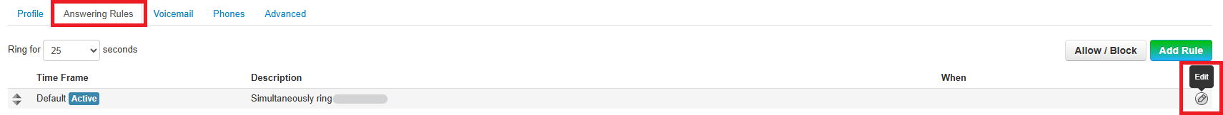 6. Click the Answering Rule tab and edit the Default Time Frame.