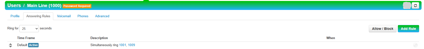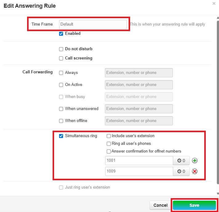 7. Add Rule to the Default Time Frame to Simultaneous Ring extensions 1001 and 1009. Click Save.