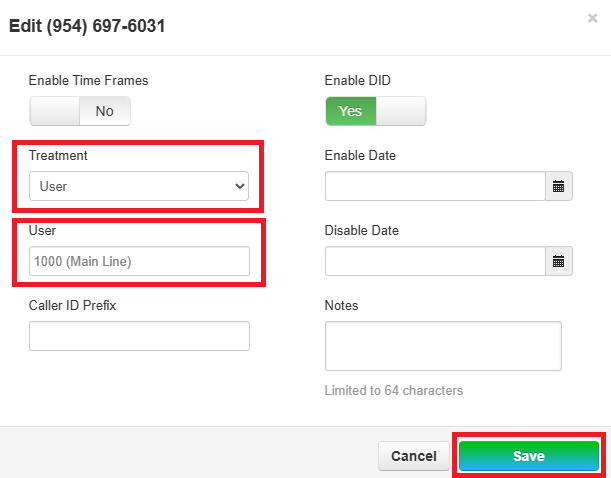 3. Assign Treatment as User and assign Ext 1000 (Main Line) to User. Click Save.