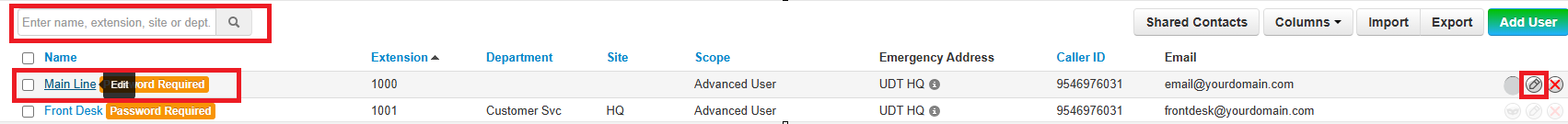 5. Locate Routing user (Main Line) Ext 1000 and click to edit. Note: you can also use the pencil to edit.