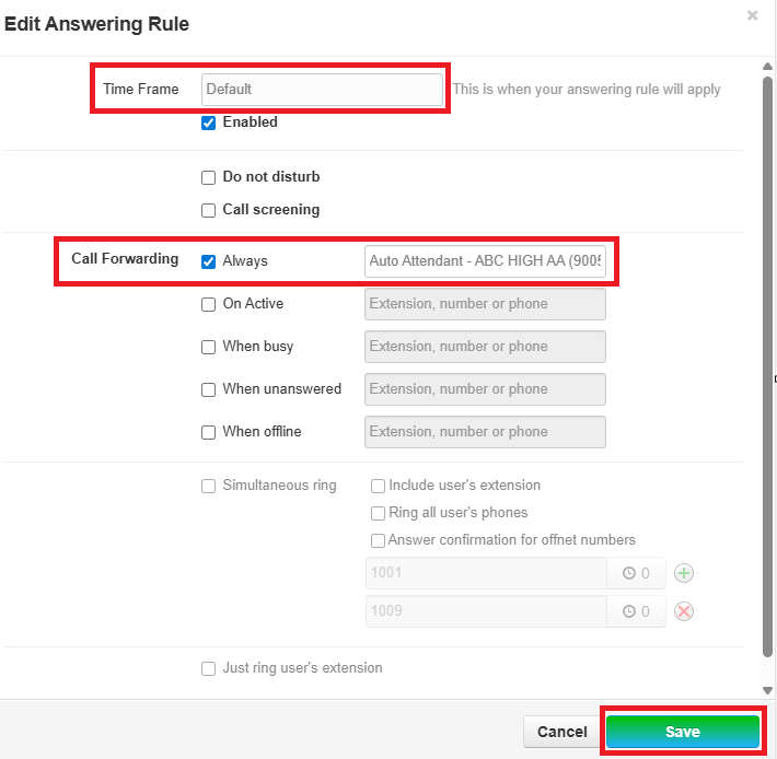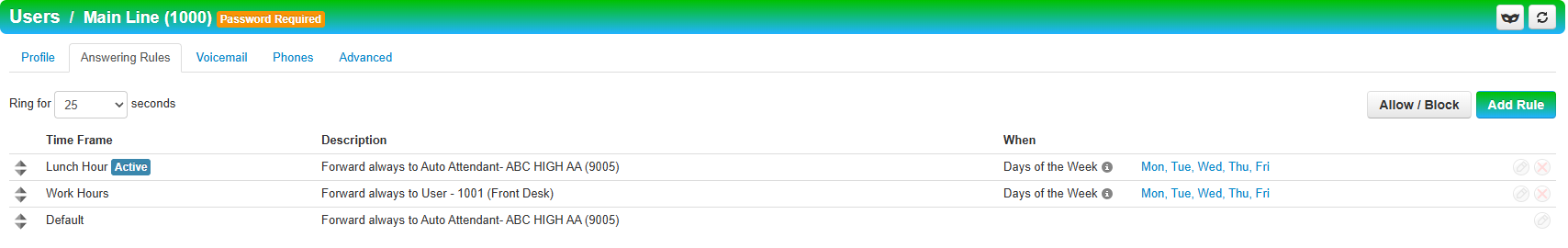 In order to set the Answering Rules for live answer during business hours and auto attendant after hours, the below prerequisites are required. Office Hours and Lunch Hour need to be determined, and the Time Frames built (see How to Build Time Frames documentation).