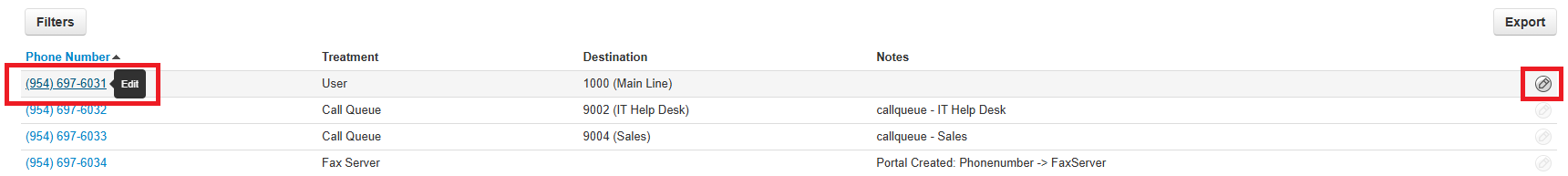 5. Locate the Routing User (Main Line) Ext 1000 and click to edit. Note: you can also use the pencil to edit.