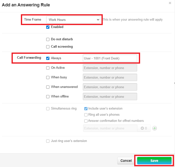 8. Add Time Frame of Work Hours to Forward Always to Front Desk. Click Save.