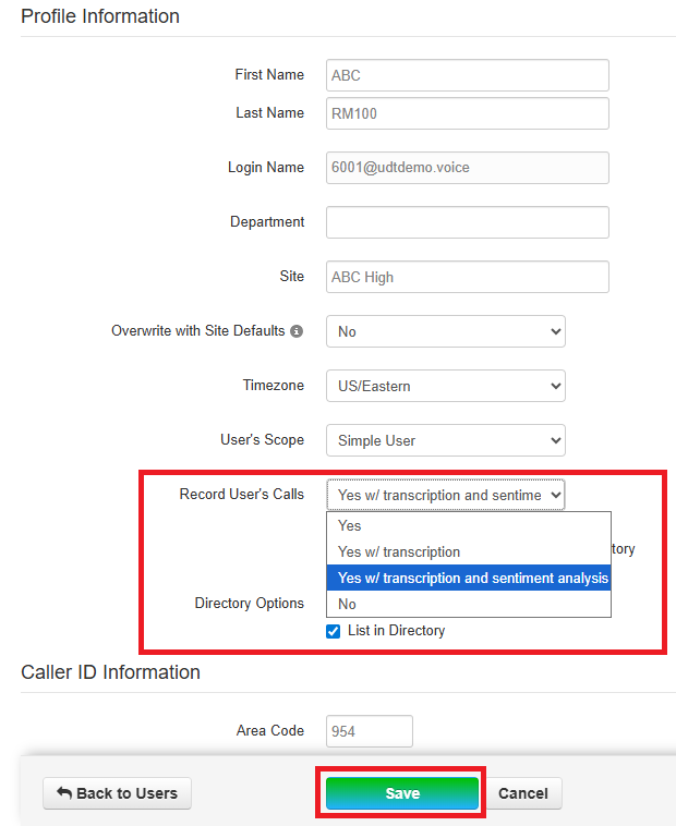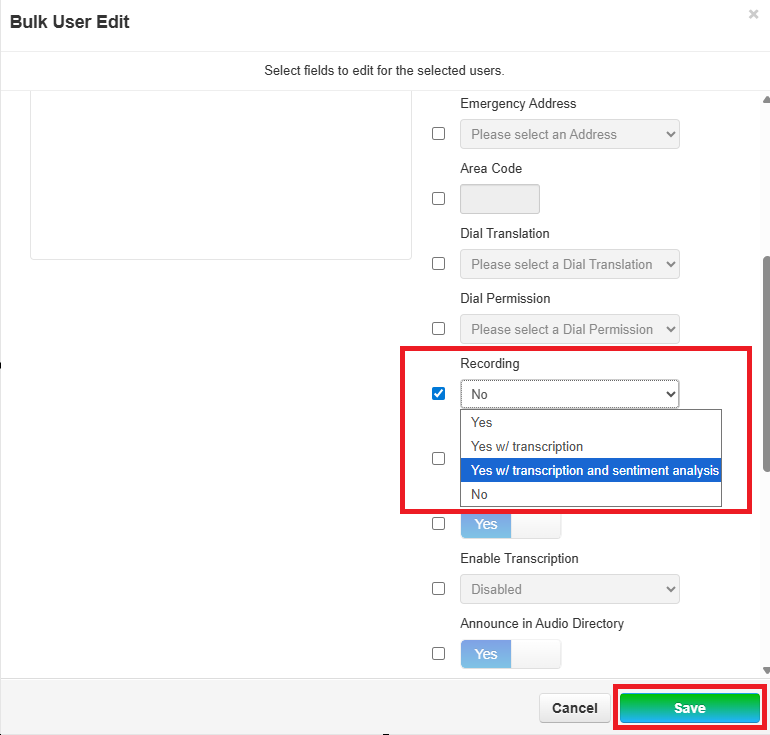 You can also use the Bulk Edit option for making edits to multiple users. See How to Make Bulk Edits to Multiple User Accounts here. When using Bulk Edit, select Recording and Yes, w/transcription and sentiment analysis. Click Save.