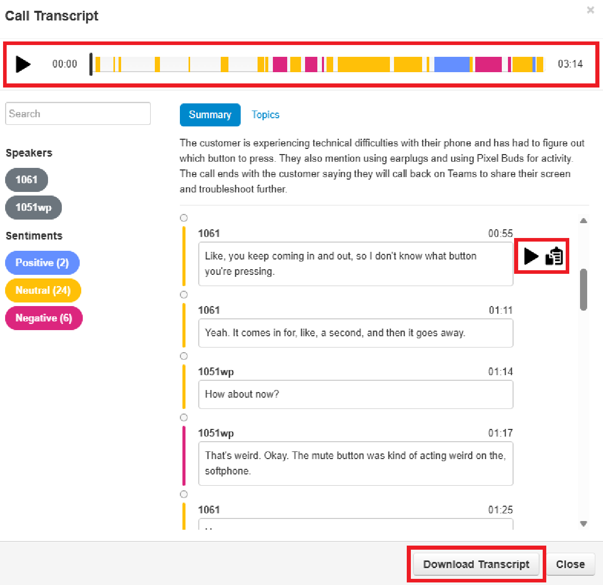 4. From here you can listen to the whole transcript from the audio bar, listen to each individual text (both are separated in to the color of corresponding sentiment), and downloaded.