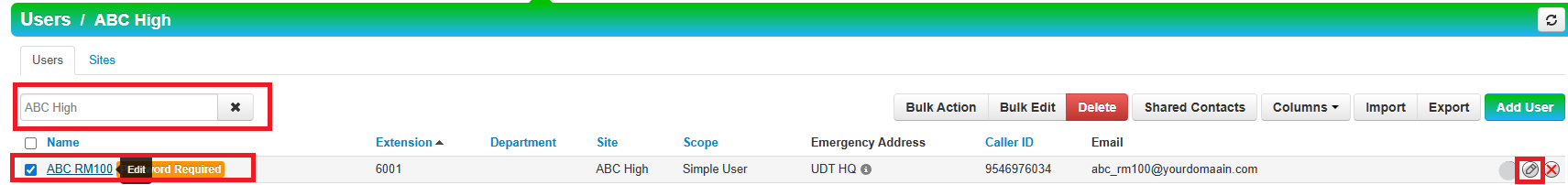2. Use the search to find desired user then click the blue name to edit OR use the pencil to open edit options.