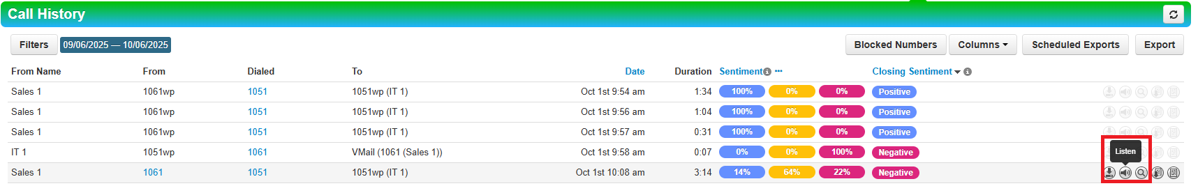 3. Click on the Listen icon to open the Call Transcript page.