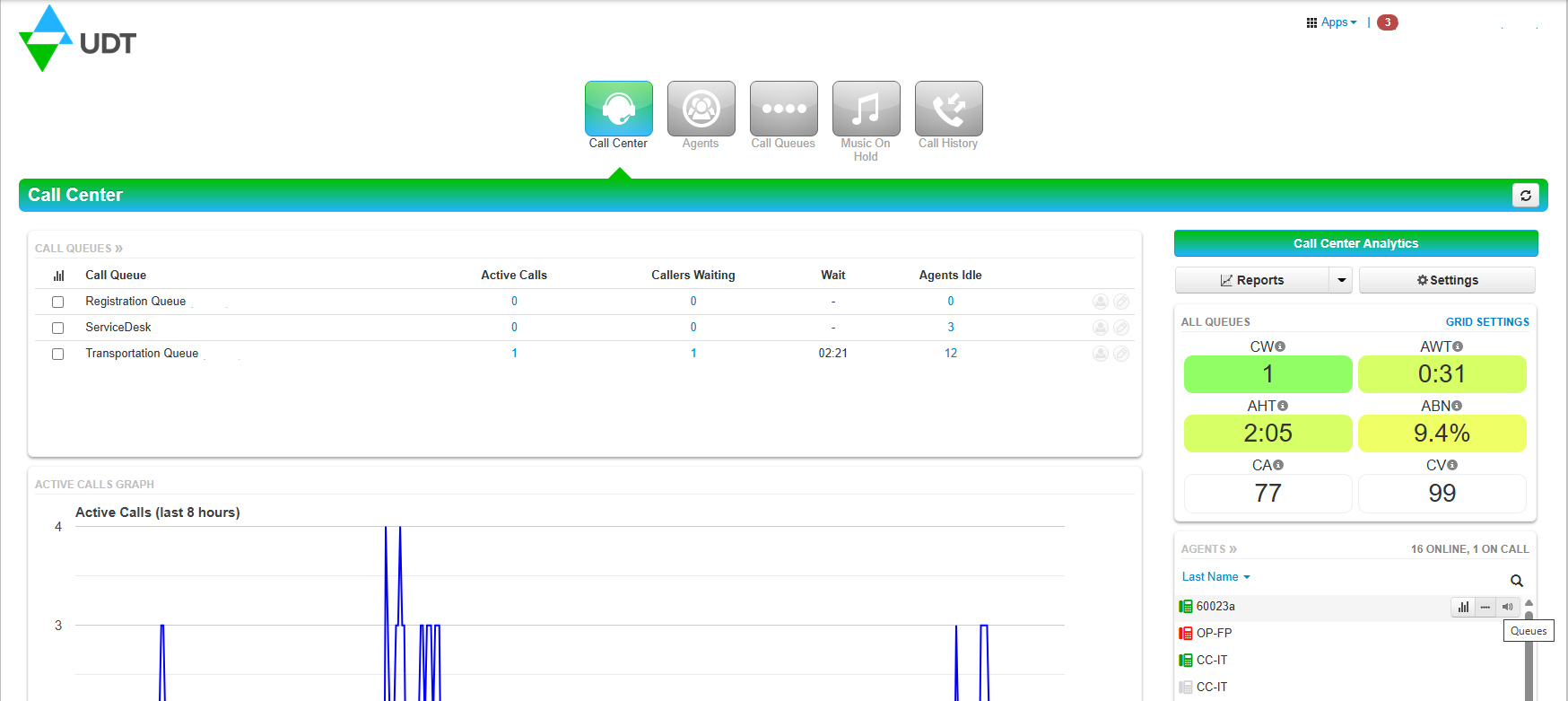 From the Call Center tab, Call Center Supervisors can see Call Center Analytics, run reports, edit Call Queues and edit Agent status.