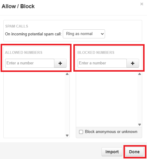 5. Allowed Numbers and Blocked Numbers can be manually entered. Note: use the plus sign to add more numbers.